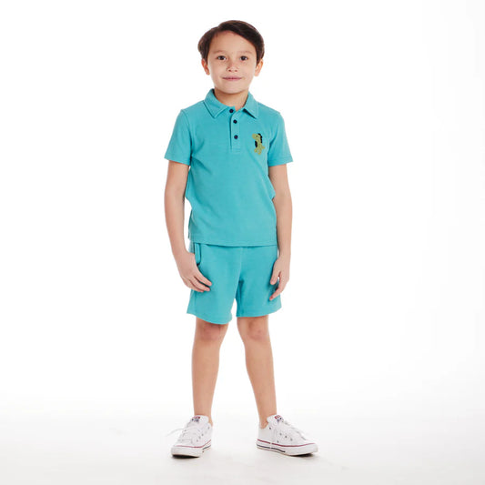 Aqua waffle polo set w. chest dino patch