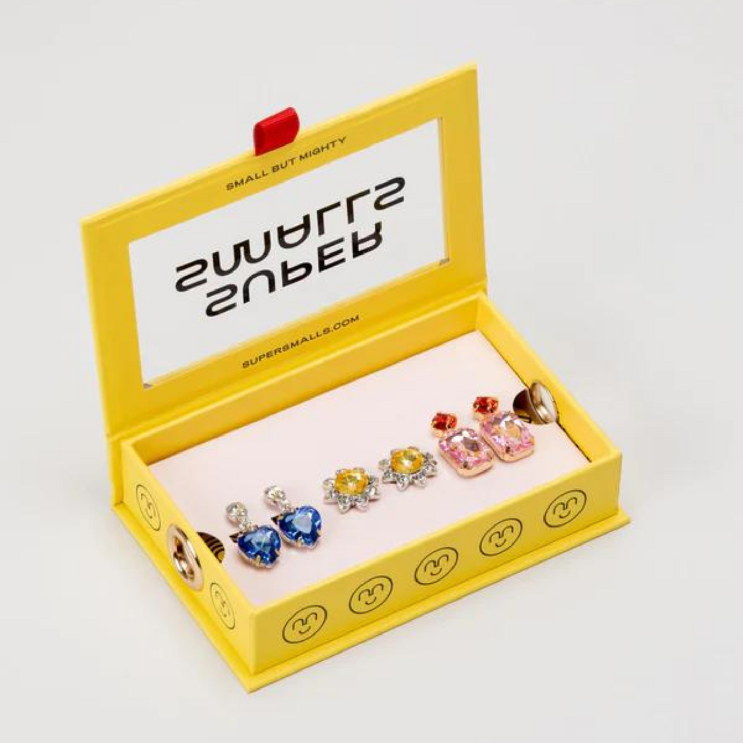 Extra popcorn, please! We’re taking these babies out on the town. This set includes three pairs of clip-on earrings with serious high-wattage sparkle. Choose from blue hearts, yellow flowers, or pink “emerald-cut” gems—or, take after the grown ups and mix them all to create your own marvelous ear stack!