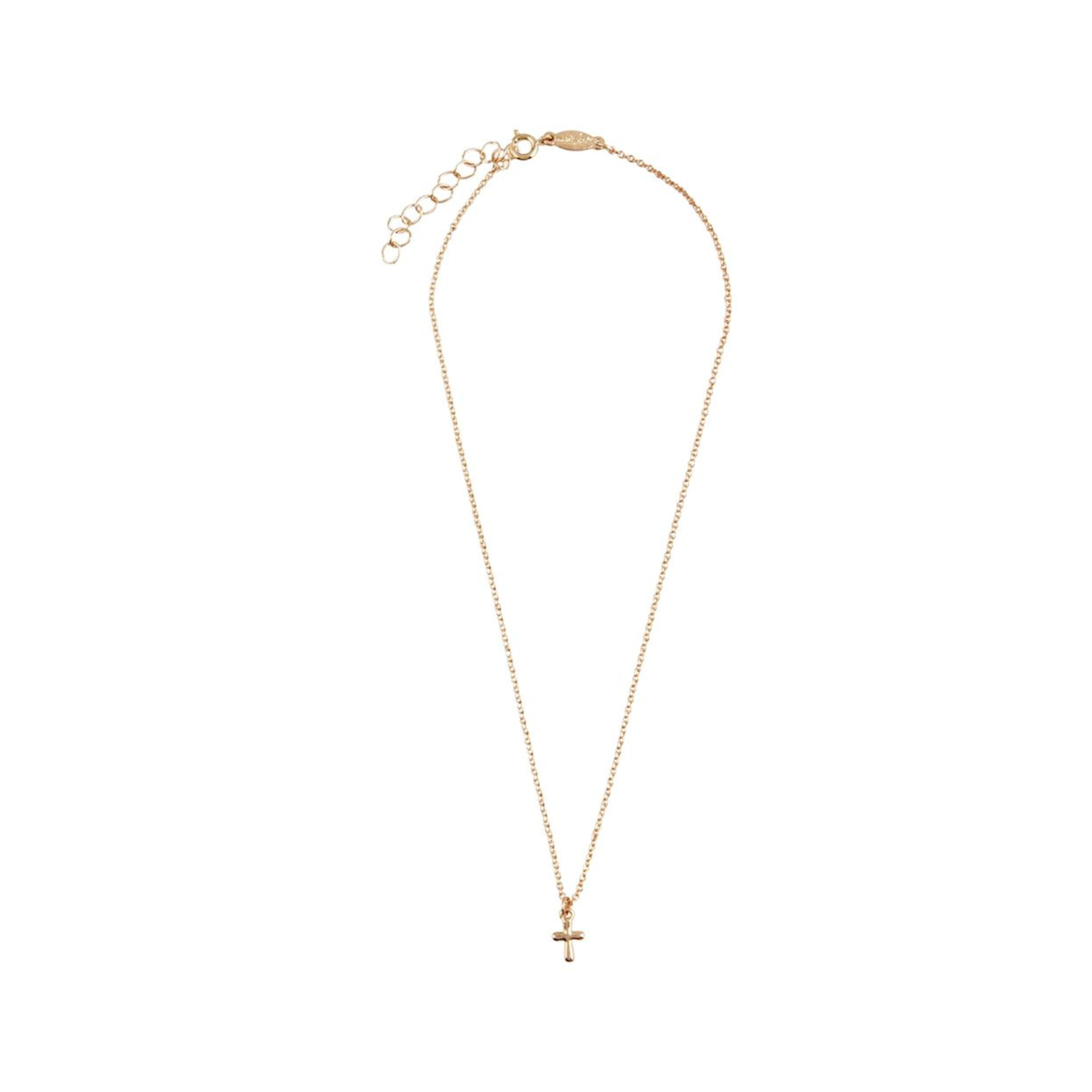 Petite metal cross necklace with delicate chain. Lobster clasp closure.