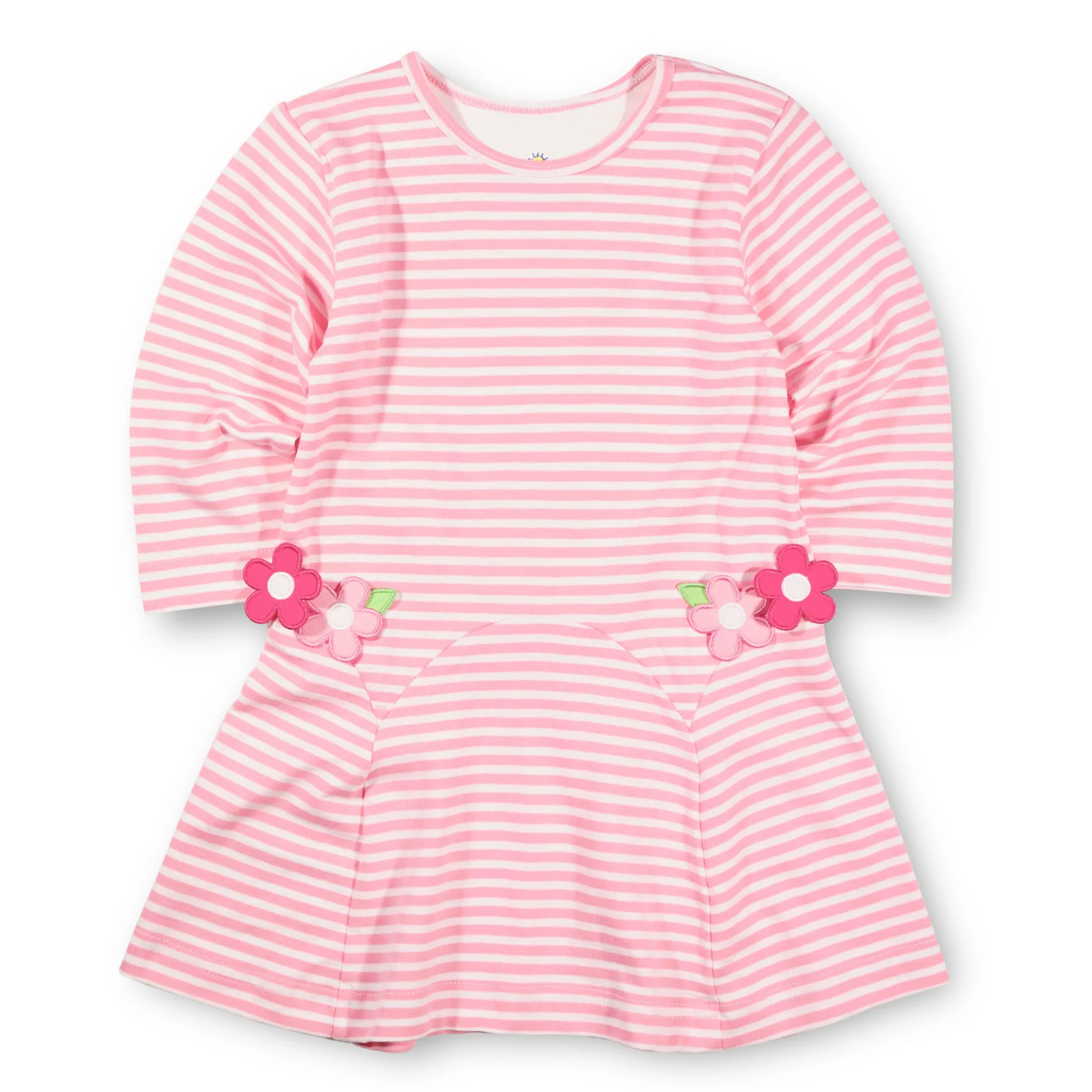 Sweet and simple, this dress is crafted from pink and white yarn-dyed stripe interlock knit. Appliqué flowers in multiple shades of pink bloom adorn the waist, adding cheerful charm to the classic silhouette.