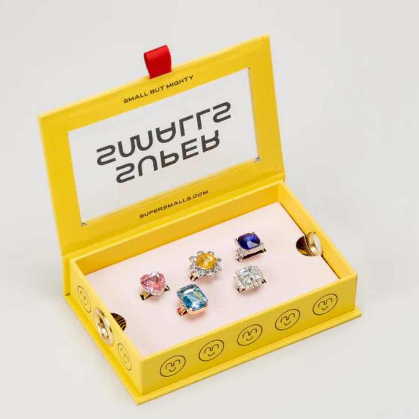 Serious Sparkle, Because We Mean Business.Grab your pals, we’re power-lunching! Swanky, stylish, and super sparkly, these rings are sure to make a statement when clinking your glass of apple juice. The set includes five rings featuring colorful and oversized gemstones—perfect for decking out both hands and creating your signature stack… or (if you must), sharing the sparkle with the table and matching with friends.All items come in our yellow gift box or signature packaging.