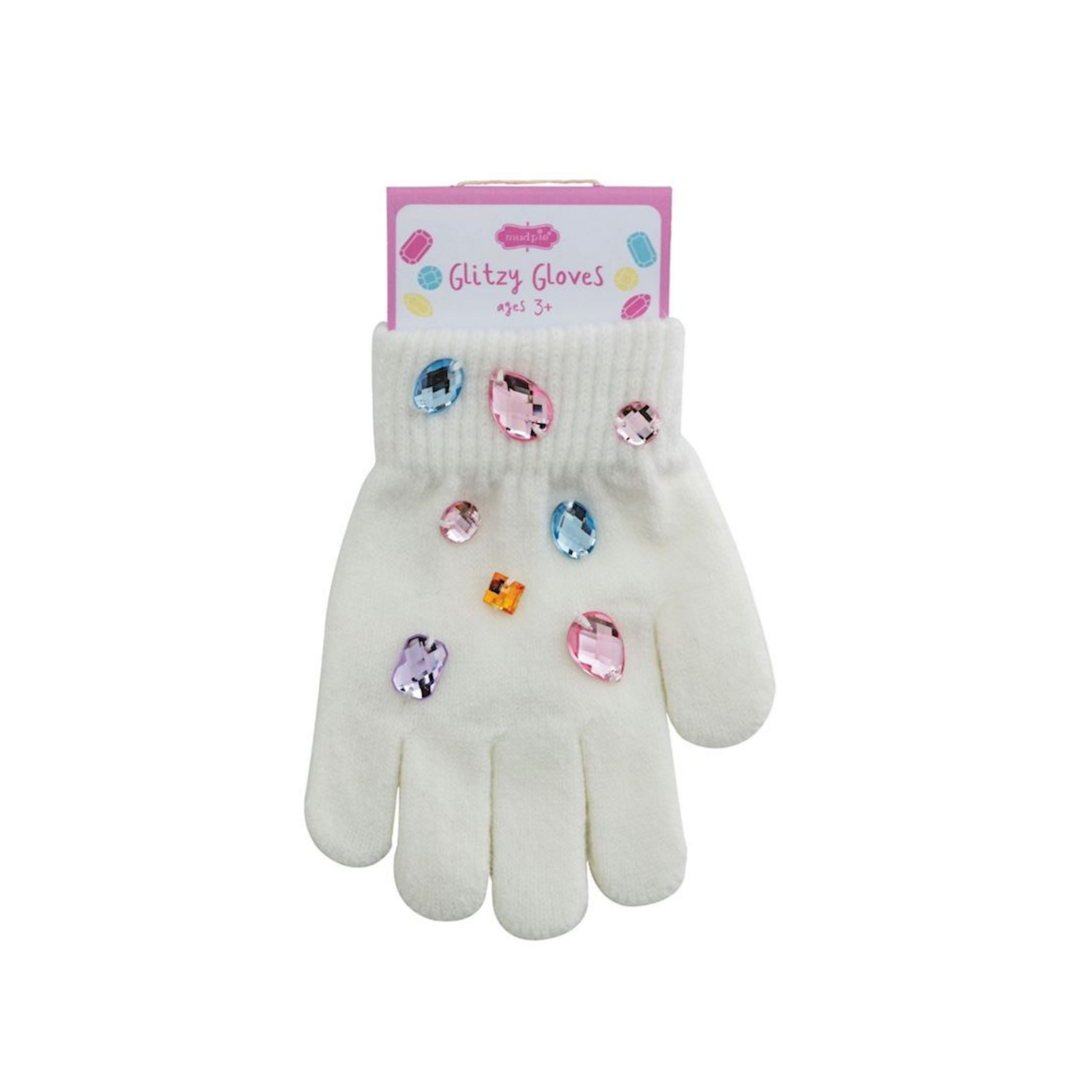 Sweater knit glove with rhinestones at wrist cuffs and ring finger.