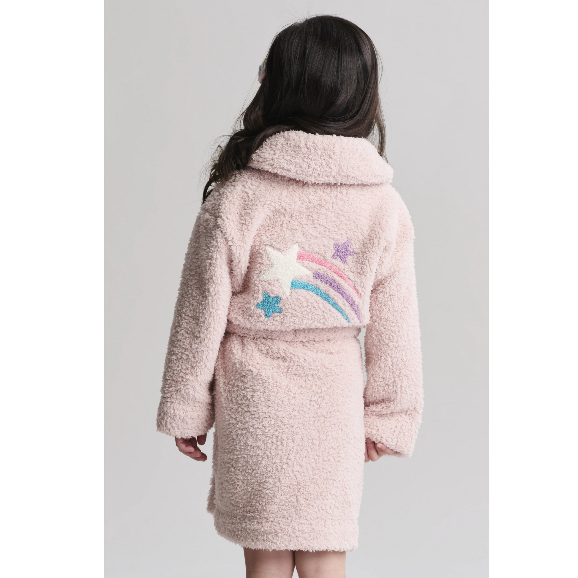 Let your little one drift into cozy dreams with our Brushed CozyChic® Toddler Embroidered Star Robe — where plush softness meets celestial wonder. Made with our iconic CozyChic® fabric, this toddler-sized robe is gently luxurious, featuring a classic shawl collar, self-tie belt, and patch pockets for tiny treasures. Beautiful embroidered stars and a crescent moon adorn the chest and pockets, while a magical shooting star motif shines across the back. Whether wrapping up after bath time or winding down for the night, this robe brings warmth, imagination, and a little stardust to your toddler’s everyday routine.
