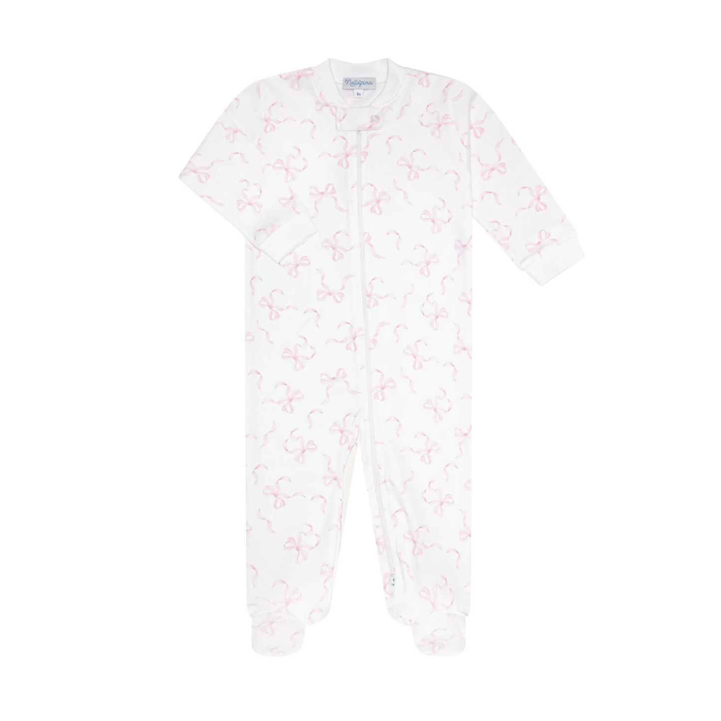 This ultra-soft footie is crafted from 100% Peruvian Pima cotton and designed with both comfort and convenience in mind. The 2-way zipper allows for quick diaper changes from top or bottom, making it ideal for day or night. Featuring our delicate bow print and finished with fine stitching and trim, it’s a perfect blend of practicality and timeless style — whether for sleep, play, or gifting.