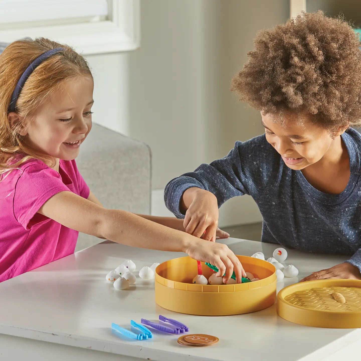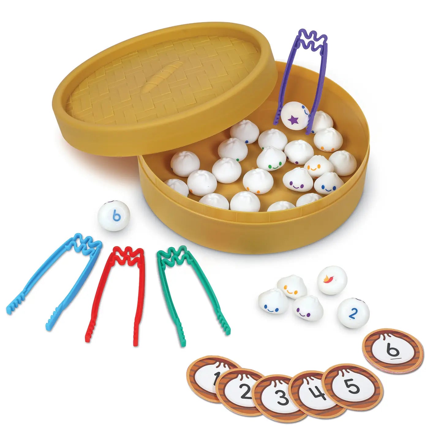 Turn math into a delicious fast-paced dash for the win with this fine motor dumpling bonanza! Draw a number card, then pick and match two numbered dumplings that add or subtract to the number shown, but watch out for surprises—you might lose a turn, name your own number, and more! In addition to early math skills, kids also hone fine motor skills as they play. Plus, the steamer basket doubles as game board and storage!
