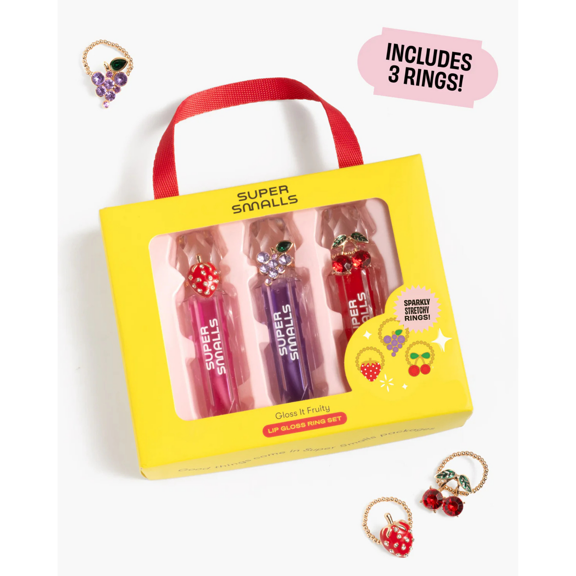 - Includes 3 crystal-cut lip glosses with matching stretchy rings