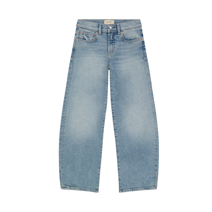 Lilia is a relaxed barrel leg silhouette for a trendy Y2K look. Lt Island Park is a vintage style pale blue. It features silver shank, copper rivets, multi-stitching, clean hem, and a ecru back patch