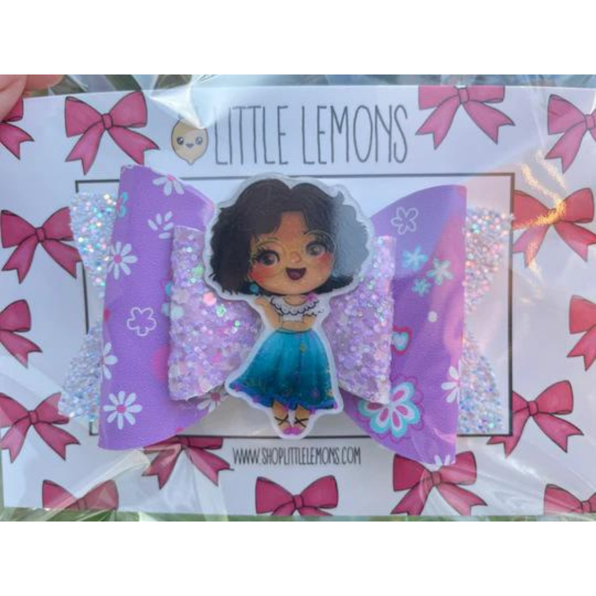 This bow is made of vegan leather and it measures four inches long. It is attached to an alligator clip.