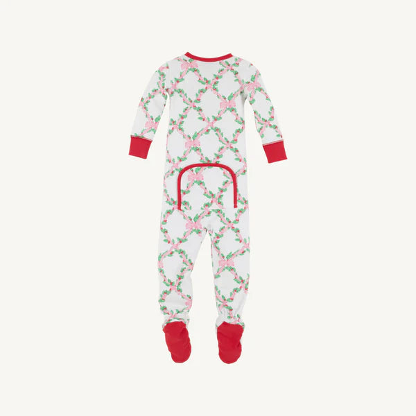 Happy holly-days! Our Noelle's Night Night featuring T.B.B.C. Holly Day, a holiday twist on our classic Belle Meade Bow print, couldn't be sweeter! Made from Pima Cotton, this pajama features built-in feet and a zip-front closure making it as practical as it is adorable.