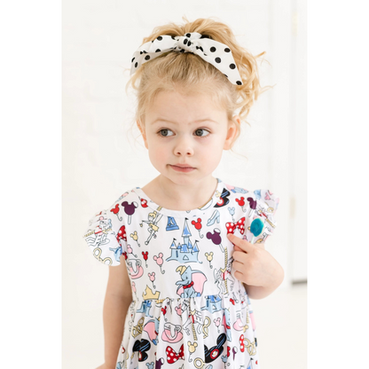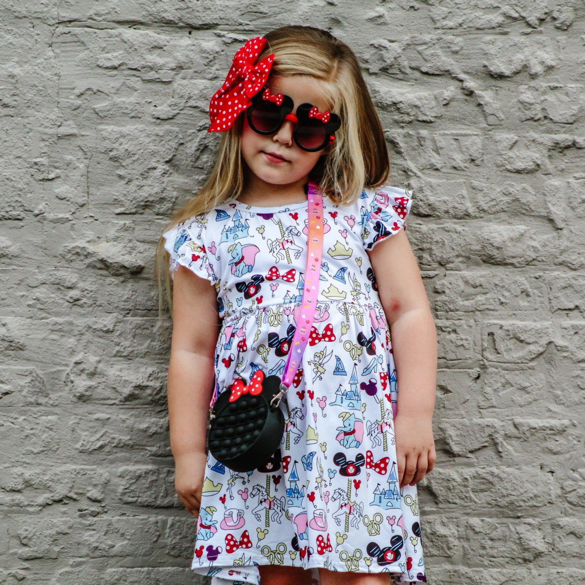 The Silly Girl Dress from Gussy Up Bow Co. is the perfect fit for your little princess! Whether she's at the playground or the happiest place on earth, she'll be cute, comfy, and covered in characters in our picture-perfect knee length dress. Crafted from buttery soft, wrinkle resistant fabric, this fun spin-dress is perfect for travel. It features a few of every girl's favorite things: sweet flutter sleeves, and a simple crew neckline. Classic shapes, magical characters, and iconic ears adorn her as she makes memories that last a lifetime.