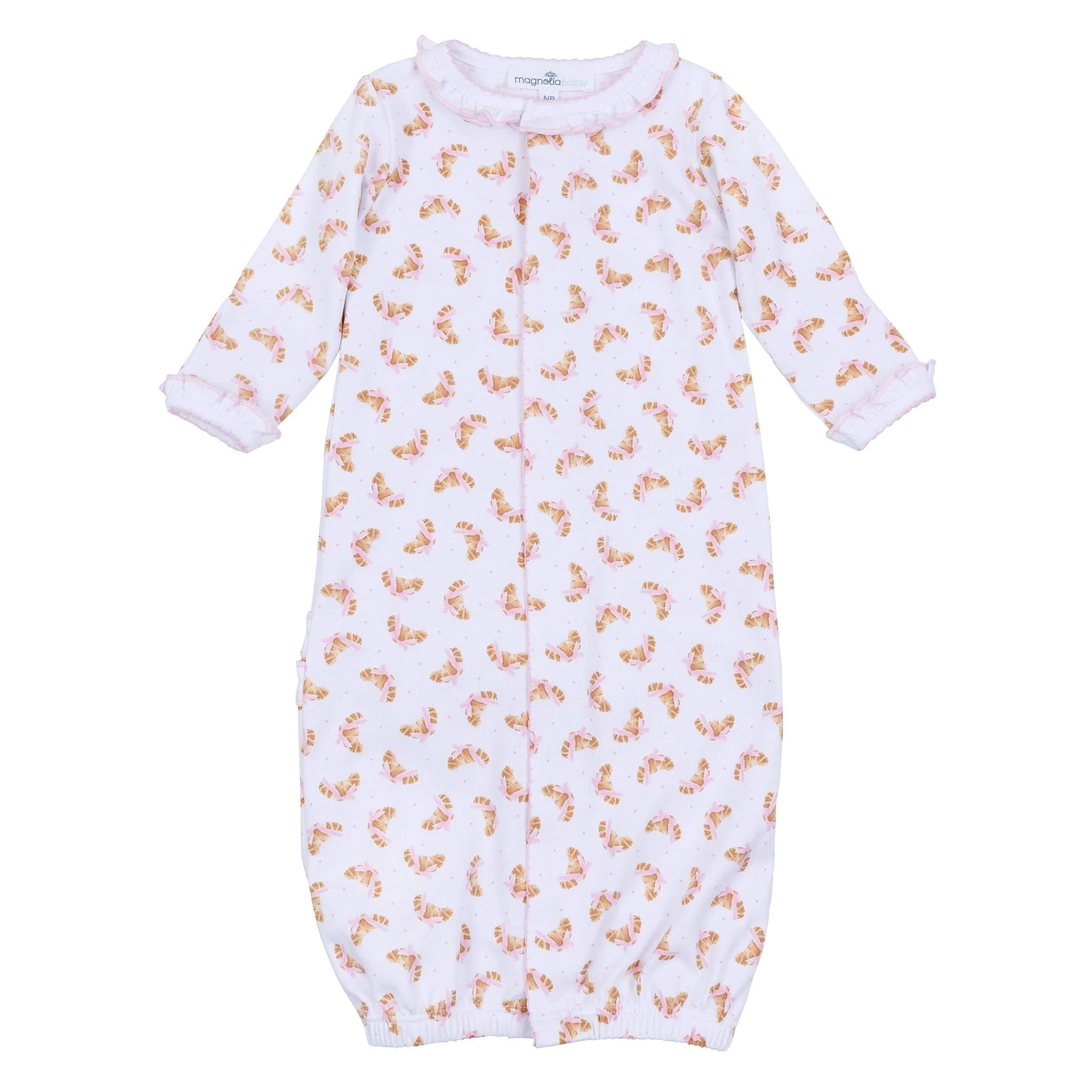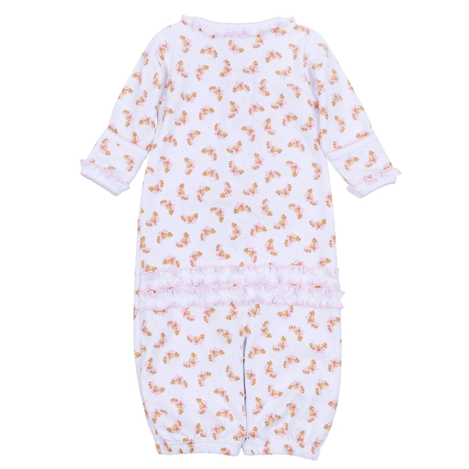 This lovely convertible footie is crafted from luxurious Pima Cotton. It features a delicate all-over croissant print and sweet ruffle accents, with convertible feet for an easy transition from sleep to play.