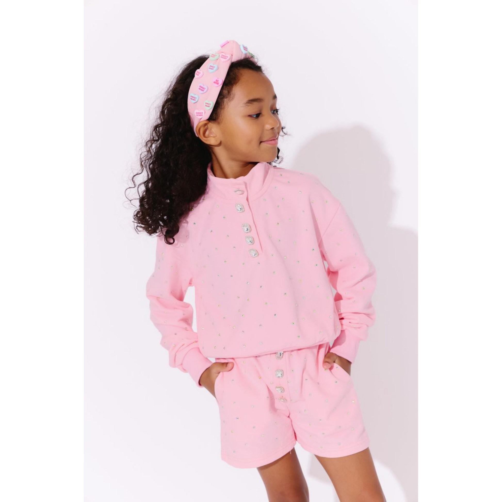 - Adorable two-piece short set featuring a sparkling stud design and pearl-button details for a chic and playful look.