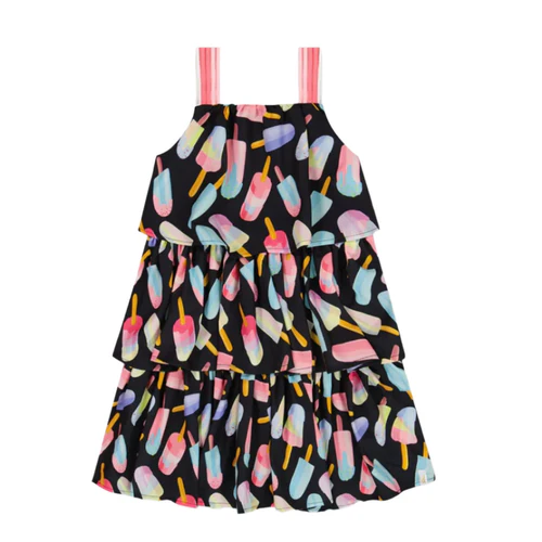 With its colorful allover popsicle print, our Printed Tiered Dress Ice Lollipops and Black is sure to become her favorite new warm weather look. Ultra-sweet in a tiered silhouette with overlays that swing and flow, this dress features wide striped straps, a square neckline, and an A-line silhouette that makes it super comfortable to wear. In this dress, she'll make a bold statement and stand out in the crowd!