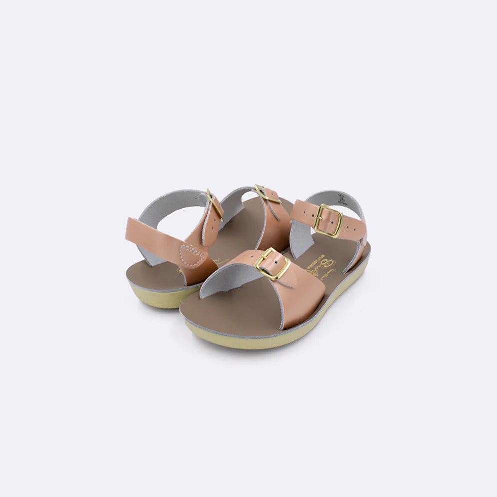 The Sun-San Surfer is a classic two-strap sandal that’s perfect for younger feet. An adjustable toe buckle and ankle strap make them great for both wide and narrow feet. Wear them comfortably all day long — thanks to the lightweight, cushioned urethane sole. Rust-proof brass buckles and scuff-resistant water-friendly genuine leather make them ideal for in-and-out-of-water wear. They clean up so easily and with proper care, they will last for years.