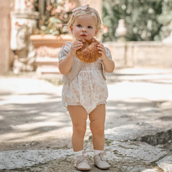 The Swan Toile Bubble is a dainty, Parisian-inspired piece designed for little ones to stay cool and comfortable. Light and airy, it layers beautifully under a knit cardigan and pairs perfectly with knee socks for a timeless look.