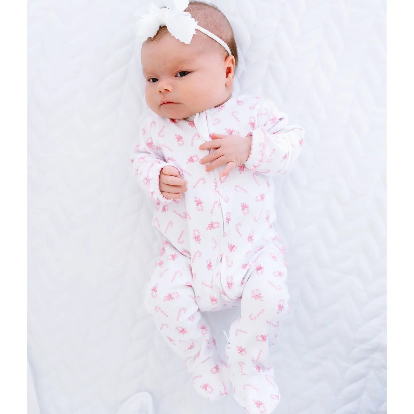 Snuggle into the festive season with our Sweet Peppermint Print Zip Footie. Inspired by sweet candy canes, this charming white footie, crafted from luxurious Pima Cotton, features an all-over print and a two-way zipper for quick and cozy changes.
